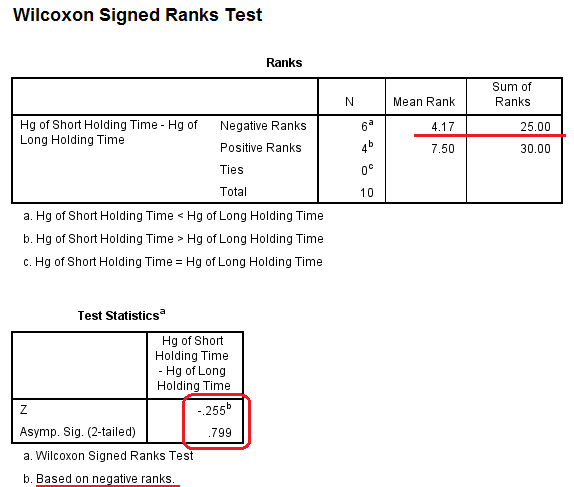 Wilcoxon符号秩检验,在进行双侧检验(最为常用)时,取正、负秩和中绝对值较小者为检验统计量(以$T$表示),本例正差值的秩和为30,负差值的秩和为25,故统计量$T=25$;而Test Statistics表中的z值,是为求得$T=25$对应的P值,基于正态近似法将$T$代入公式计算而来。