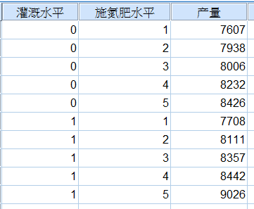 由于不同施肥水平与灌溉水平的组合仅1个数据,交互项不能放入一般线性模型中,否则(两个固定效应因素的情况下)无法得出方差分析的检验结果。
